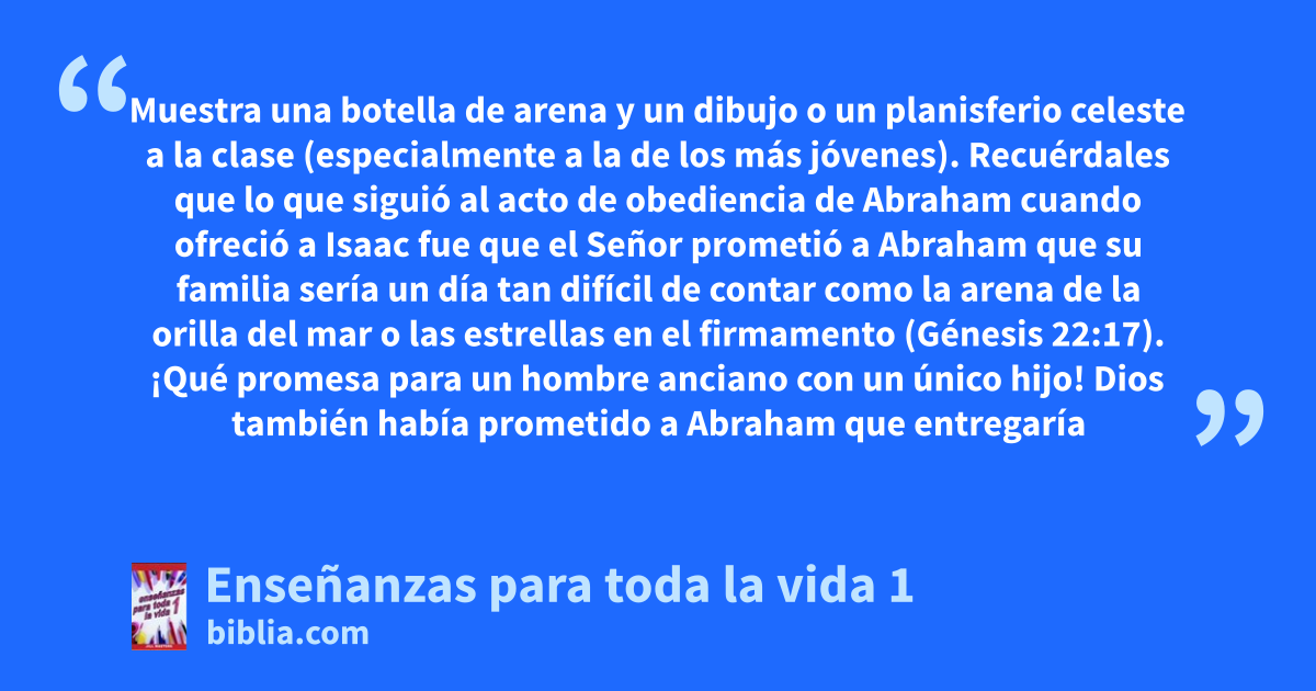 Muestra una botella de arena y un dibujo o un planisferio celeste a la clase (especialmente a la de los más jóvenes). Recuérdales que lo que siguió al acto de obediencia de Abraham cuando ofreció a Isaac fue que el Señor prometió a Abraham que su familia sería un día tan difícil de contar como la arena de la orilla del mar o las estrellas en el firmamento (Génesis 22:17). ¡Qué promesa para un hombre anciano con un único hijo! Dios también había prometido a Abraham que entregaría