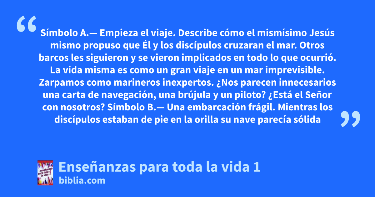 Símbolo A.— Empieza el viaje. Describe cómo el mismísimo Jesús mismo propuso que Él y los discípulos cruzaran el mar. Otros barcos les siguieron y se vieron implicados en todo lo que ocurrió. La vida misma es como un gran viaje en un mar imprevisible. Zarpamos como marineros inexpertos. ¿Nos parecen innecesarios una carta de navegación, una brújula y un piloto? ¿Está el Señor con nosotros? Símbolo B.— Una embarcación frágil. Mientras los discípulos estaban de pie en la orilla su nave parecía sólida