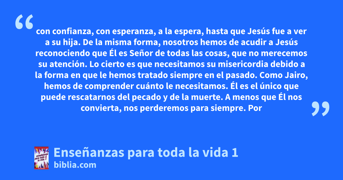 con confianza, con esperanza, a la espera, hasta que Jesús fue a ver a su hija. De la misma forma, nosotros hemos de acudir a Jesús reconociendo que Él es Señor de todas las cosas, que no merecemos su atención. Lo cierto es que necesitamos su misericordia debido a la forma en que le hemos tratado siempre en el pasado. Como Jairo, hemos de comprender cuánto le necesitamos. Él es el único que puede rescatarnos del pecado y de la muerte. A menos que Él nos convierta, nos perderemos para siempre. Por