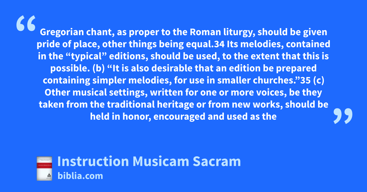 Gregorian chant, as proper to the Roman liturgy, should be given pride of place, other things being equal.34 Its melodies, contained in the “typical” editions, should be used, to the extent that this is possible. (b) “It is also desirable that an edition be prepared containing simpler melodies, for use in smaller churches.”35 (c) Other musical settings, written for one or more voices, be they taken from the traditional heritage or from new works, should be held in honor, encouraged and used as the