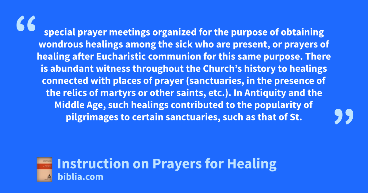 special prayer meetings organized for the purpose of obtaining wondrous healings among the sick who are present, or prayers of healing after Eucharistic communion for this same purpose. There is abundant witness throughout the Church’s history to healings connected with places of prayer (sanctuaries, in the presence of the relics of martyrs or other saints, etc.). In Antiquity and the Middle Age, such healings contributed to the popularity of pilgrimages to certain sanctuaries, such as that of St.
