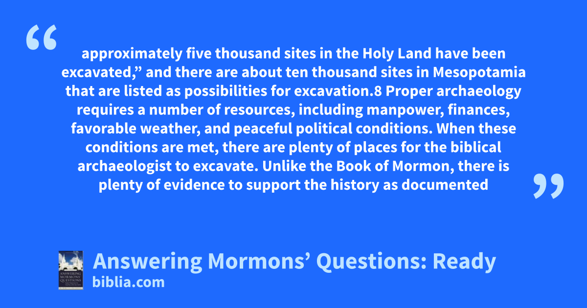 approximately five thousand sites in the Holy Land have been excavated,” and there are about ten thousand sites in Mesopotamia that are listed as possibilities for excavation.8 Proper archaeology requires a number of resources, including manpower, finances, favorable weather, and peaceful political conditions. When these conditions are met, there are plenty of places for the biblical archaeologist to excavate. Unlike the Book of Mormon, there is plenty of evidence to support the history as documented