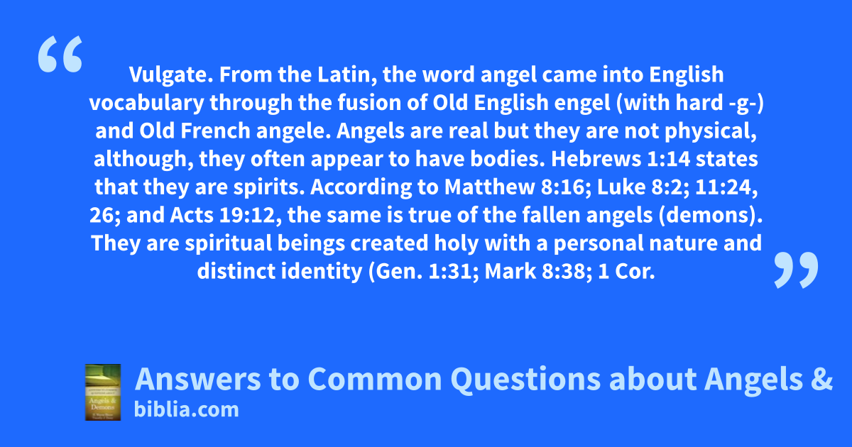 Vulgate. From the Latin, the word angel came into English vocabulary through the fusion of Old English engel (with hard -g-) and Old French angele. Angels are real but they are not physical, although, they often appear to have bodies. Hebrews 1:14 states that they are spirits. According to Matthew 8:16; Luke 8:2; 11:24, 26; and Acts 19:12, the same is true of the fallen angels (demons). They are spiritual beings created holy with a personal nature and distinct identity (Gen. 1:31; Mark 8:38; 1 Cor.