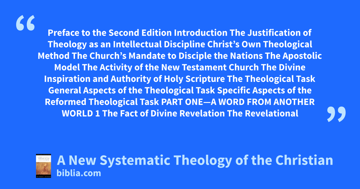 Preface to the Second Edition Introduction The Justification of Theology as an Intellectual Discipline Christ’s Own Theological Method The Church’s Mandate to Disciple the Nations The Apostolic Model The Activity of the New Testament Church The Divine Inspiration and Authority of Holy Scripture The Theological Task General Aspects of the Theological Task Specific Aspects of the Reformed Theological Task PART ONE—A WORD FROM ANOTHER WORLD 1 The Fact of Divine Revelation The Revelational