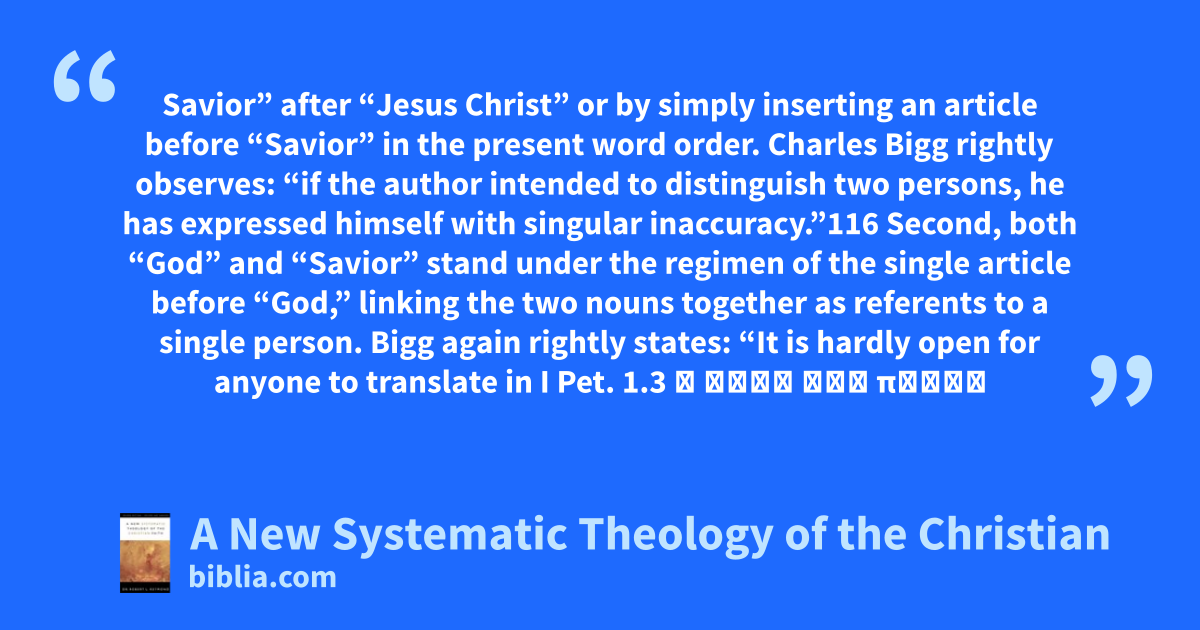 Savior” after “Jesus Christ” or by simply inserting an article before “Savior” in the present word order. Charles Bigg rightly observes: “if the author intended to distinguish two persons, he has expressed himself with singular inaccuracy.”116 Second, both “God” and “Savior” stand under the regimen of the single article before “God,” linking the two nouns together as referents to a single person. Bigg again rightly states: “It is hardly open for anyone to translate in I Pet. 1.3 ὁ θεὸς καὶ πατὴρ