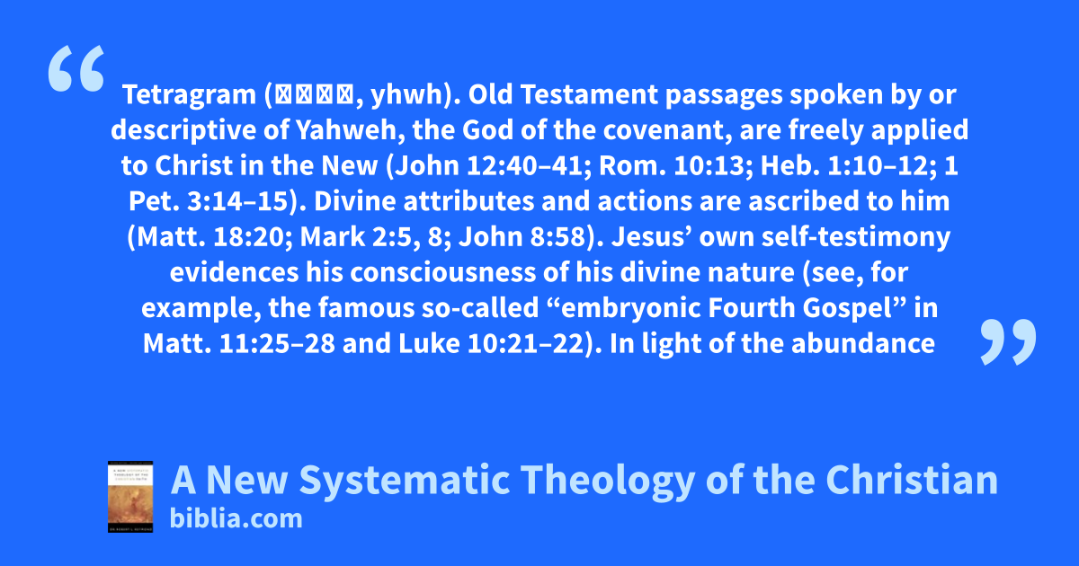 Tetragram (יהוה, yhwh). Old Testament passages spoken by or descriptive of Yahweh, the God of the covenant, are freely applied to Christ in the New (John 12:40–41; Rom. 10:13; Heb. 1:10–12; 1 Pet. 3:14–15). Divine attributes and actions are ascribed to him (Matt. 18:20; Mark 2:5, 8; John 8:58). Jesus’ own self-testimony evidences his consciousness of his divine nature (see, for example, the famous so-called “embryonic Fourth Gospel” in Matt. 11:25–28 and Luke 10:21–22). In light of the abundance