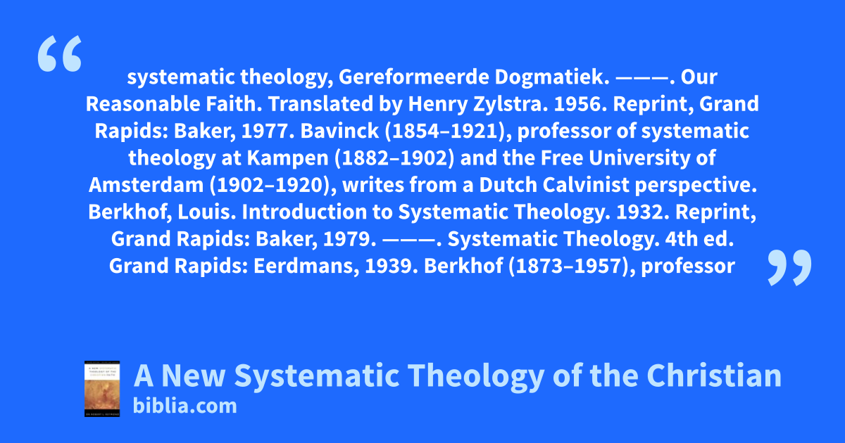systematic theology, Gereformeerde Dogmatiek. ———. Our Reasonable Faith. Translated by Henry Zylstra. 1956. Reprint, Grand Rapids: Baker, 1977. Bavinck (1854–1921), professor of systematic theology at Kampen (1882–1902) and the Free University of Amsterdam (1902–1920), writes from a Dutch Calvinist perspective. Berkhof, Louis. Introduction to Systematic Theology. 1932. Reprint, Grand Rapids: Baker, 1979. ———. Systematic Theology. 4th ed. Grand Rapids: Eerdmans, 1939. Berkhof (1873–1957), professor