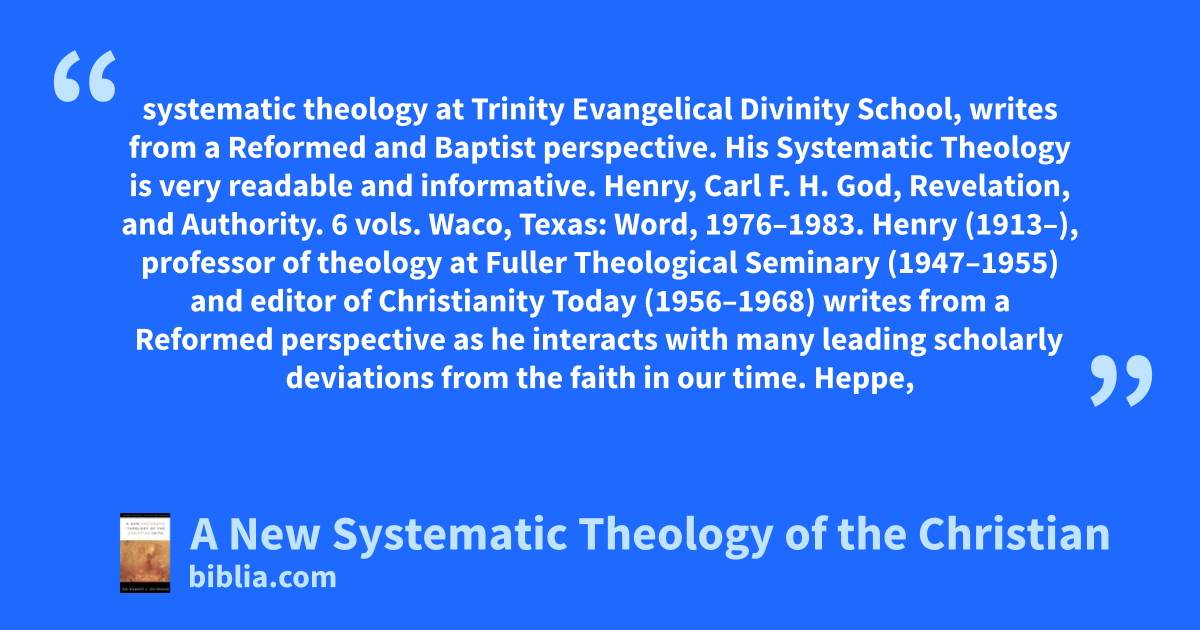 systematic theology at Trinity Evangelical Divinity School, writes from a Reformed and Baptist perspective. His Systematic Theology is very readable and informative. Henry, Carl F. H. God, Revelation, and Authority. 6 vols. Waco, Texas: Word, 1976–1983. Henry (1913–), professor of theology at Fuller Theological Seminary (1947–1955) and editor of Christianity Today (1956–1968) writes from a Reformed perspective as he interacts with many leading scholarly deviations from the faith in our time. Heppe,