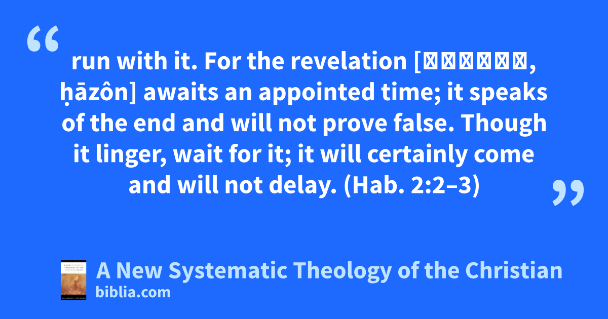 run with it. For the revelation [חָזוֹן, ḥāzôn] awaits an appointed time; it speaks of the end and will not prove false. Though it linger, wait for it; it will certainly come and will not delay. (Hab. 2:2–3)
