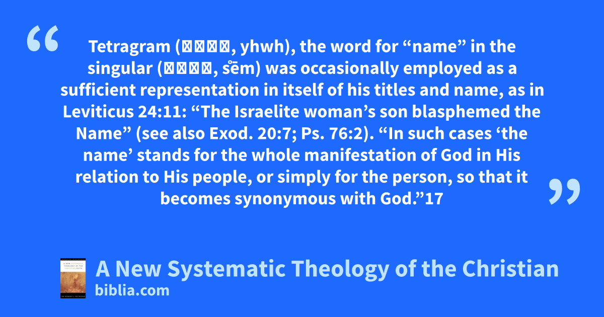 Tetragram (יהוה, yhwh), the word for “name” in the singular (שֵׁם, s̊ēm) was occasionally employed as a sufficient representation in itself of his titles and name, as in Leviticus 24:11: “The Israelite woman’s son blasphemed the Name” (see also Exod. 20:7; Ps. 76:2). “In such cases ‘the name’ stands for the whole manifestation of God in His relation to His people, or simply for the person, so that it becomes synonymous with God.”17