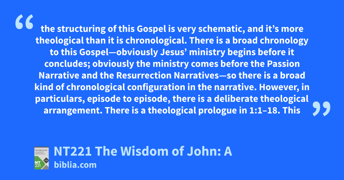 the structuring of this Gospel is very schematic, and it’s more theological than it is chronological. There is a broad chronology to this Gospel—obviously Jesus’ ministry begins before it concludes; obviously the ministry comes before the Passion Narrative and the Resurrection Narratives—so there is a broad kind of chronological configuration in the narrative. However, in particulars, episode to episode, there is a deliberate theological arrangement. There is a theological prologue in 1:1–18. This