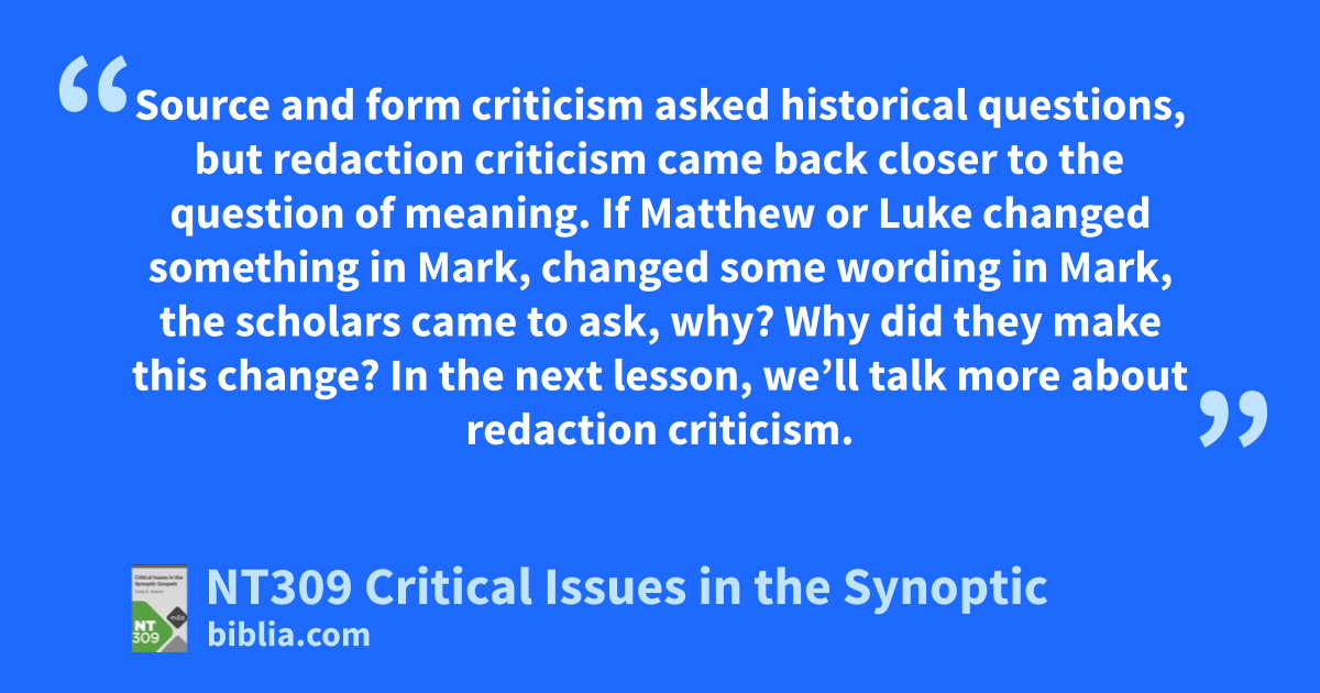 Source and form criticism asked historical questions, but redaction criticism came back closer to the question of meaning. If Matthew or Luke changed something in Mark, changed some wording in Mark, the scholars came to ask, why? Why did they make this change? In the next lesson, we’ll talk more about redaction criticism.