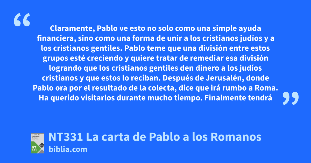 Claramente, Pablo ve esto no solo como una simple ayuda financiera, sino como una forma de unir a los cristianos judíos y a los cristianos gentiles. Pablo teme que una división entre estos grupos esté creciendo y quiere tratar de remediar esa división logrando que los cristianos gentiles den dinero a los judíos cristianos y que estos lo reciban. Después de Jerusalén, donde Pablo ora por el resultado de la colecta, dice que irá rumbo a Roma. Ha querido visitarlos durante mucho tiempo. Finalmente tendrá