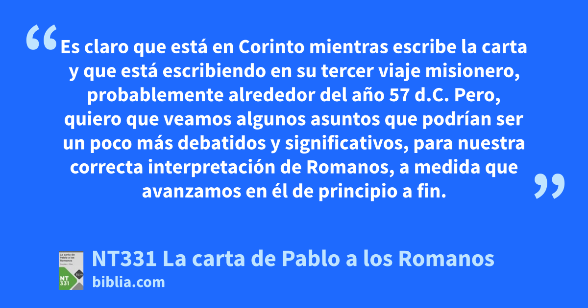 Es claro que está en Corinto mientras escribe la carta y que está escribiendo en su tercer viaje misionero, probablemente alrededor del año 57 d.C. Pero, quiero que veamos algunos asuntos que podrían ser un poco más debatidos y significativos, para nuestra correcta interpretación de Romanos, a medida que avanzamos en él de principio a fin.