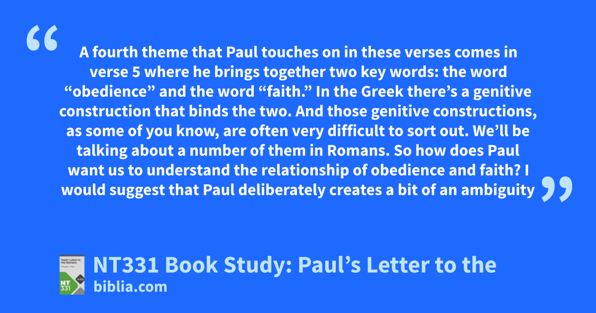 A fourth theme that Paul touches on in these verses comes in verse 5 where he brings together two key words: the word “obedience” and the word “faith.” In the Greek there’s a genitive construction that binds the two. And those genitive constructions, as some of you know, are often very difficult to sort out. We’ll be talking about a number of them in Romans. So how does Paul want us to understand the relationship of obedience and faith? I would suggest that Paul deliberately creates a bit of an ambiguity
