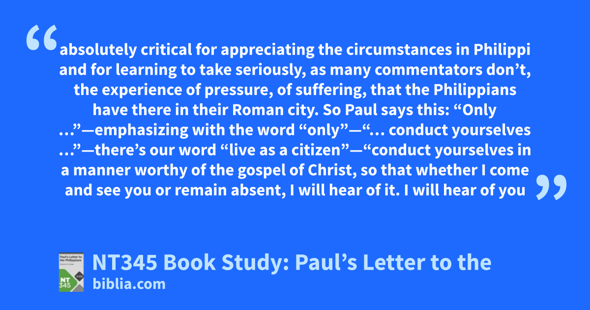 absolutely critical for appreciating the circumstances in Philippi and for learning to take seriously, as many commentators don’t, the experience of pressure, of suffering, that the Philippians have there in their Roman city. So Paul says this: “Only …”—emphasizing with the word “only”—“… conduct yourselves …”—there’s our word “live as a citizen”—“conduct yourselves in a manner worthy of the gospel of Christ, so that whether I come and see you or remain absent, I will hear of it. I will hear of you