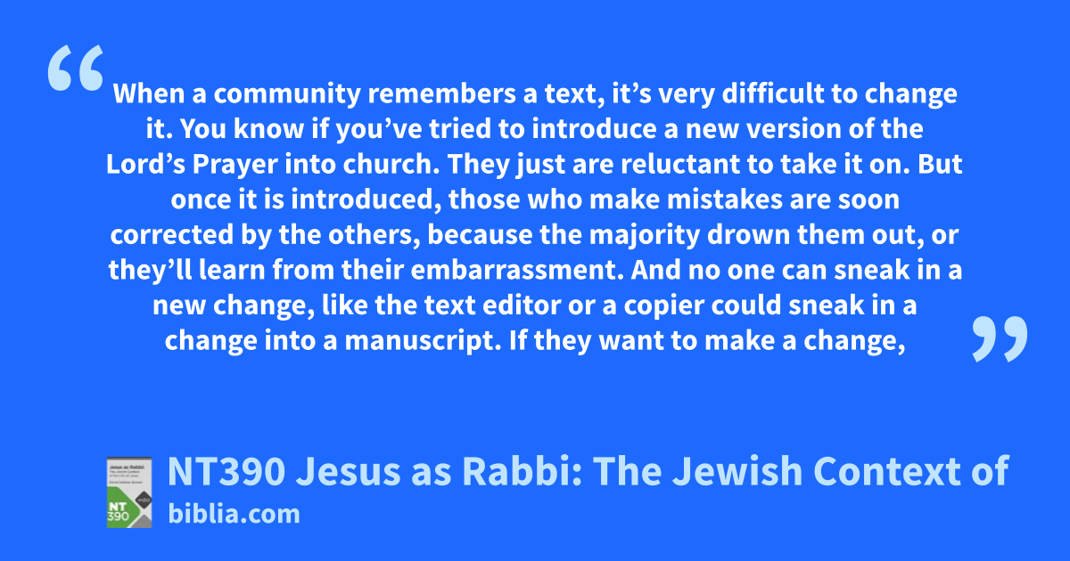 When a community remembers a text, it’s very difficult to change it. You know if you’ve tried to introduce a new version of the Lord’s Prayer into church. They just are reluctant to take it on. But once it is introduced, those who make mistakes are soon corrected by the others, because the majority drown them out, or they’ll learn from their embarrassment. And no one can sneak in a new change, like the text editor or a copier could sneak in a change into a manuscript. If they want to make a change,