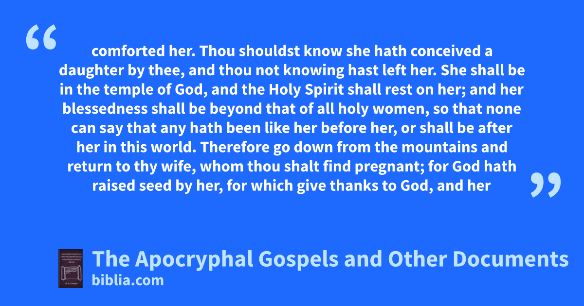 comforted her. Thou shouldst know she hath conceived a daughter by thee, and thou not knowing hast left her. She shall be in the temple of God, and the Holy Spirit shall rest on her; and her blessedness shall be beyond that of all holy women, so that none can say that any hath been like her before her, or shall be after her in this world. Therefore go down from the mountains and return to thy wife, whom thou shalt find pregnant; for God hath raised seed by her, for which give thanks to God, and her