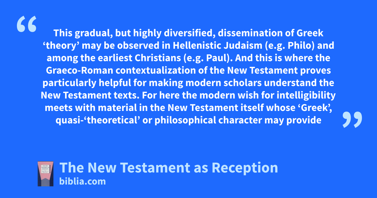 This gradual, but highly diversified, dissemination of Greek ‘theory’ may be observed in Hellenistic Judaism (e.g. Philo) and among the earliest Christians (e.g. Paul). And this is where the Graeco-Roman contextualization of the New Testament proves particularly helpful for making modern scholars understand the New Testament texts. For here the modern wish for intelligibility meets with material in the New Testament itself whose ‘Greek’, quasi-‘theoretical’ or philosophical character may provide