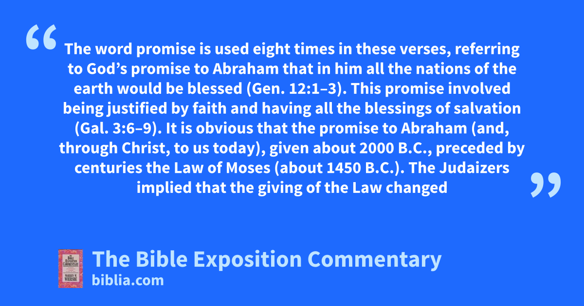 The word promise is used eight times in these verses, referring to God’s promise to Abraham that in him all the nations of the earth would be blessed (Gen. 12:1–3). This promise involved being justified by faith and having all the blessings of salvation (Gal. 3:6–9). It is obvious that the promise to Abraham (and, through Christ, to us today), given about 2000 B.C., preceded by centuries the Law of Moses (about 1450 B.C.). The Judaizers implied that the giving of the Law changed