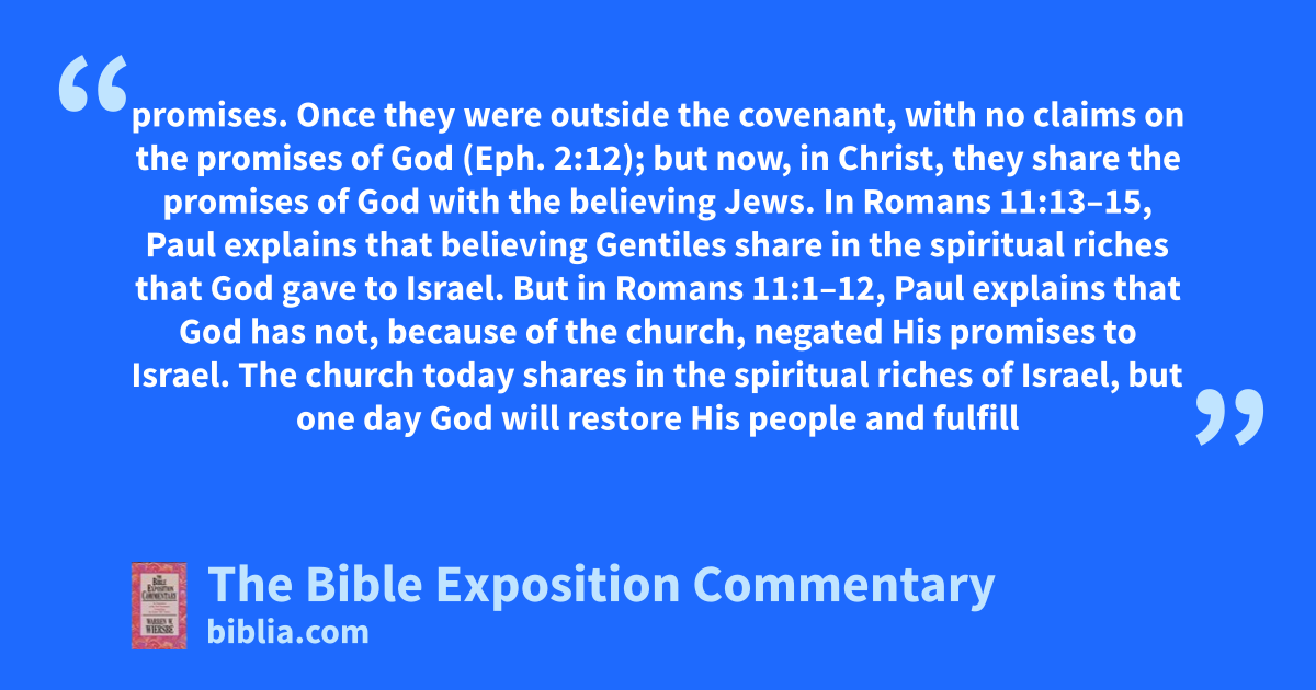 promises. Once they were outside the covenant, with no claims on the promises of God (Eph. 2:12); but now, in Christ, they share the promises of God with the believing Jews. In Romans 11:13–15, Paul explains that believing Gentiles share in the spiritual riches that God gave to Israel. But in Romans 11:1–12, Paul explains that God has not, because of the church, negated His promises to Israel. The church today shares in the spiritual riches of Israel, but one day God will restore His people and fulfill