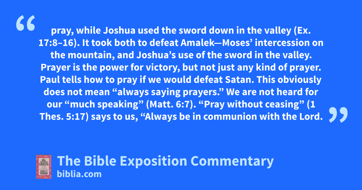 pray, while Joshua used the sword down in the valley (Ex. 17:8–16). It took both to defeat Amalek—Moses’ intercession on the mountain, and Joshua’s use of the sword in the valley. Prayer is the power for victory, but not just any kind of prayer. Paul tells how to pray if we would defeat Satan. This obviously does not mean “always saying prayers.” We are not heard for our “much speaking” (Matt. 6:7). “Pray without ceasing” (1 Thes. 5:17) says to us, “Always be in communion with the Lord.