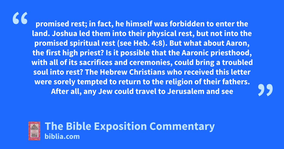 promised rest; in fact, he himself was forbidden to enter the land. Joshua led them into their physical rest, but not into the promised spiritual rest (see Heb. 4:8). But what about Aaron, the first high priest? Is it possible that the Aaronic priesthood, with all of its sacrifices and ceremonies, could bring a troubled soul into rest? The Hebrew Christians who received this letter were sorely tempted to return to the religion of their fathers. After all, any Jew could travel to Jerusalem and see
