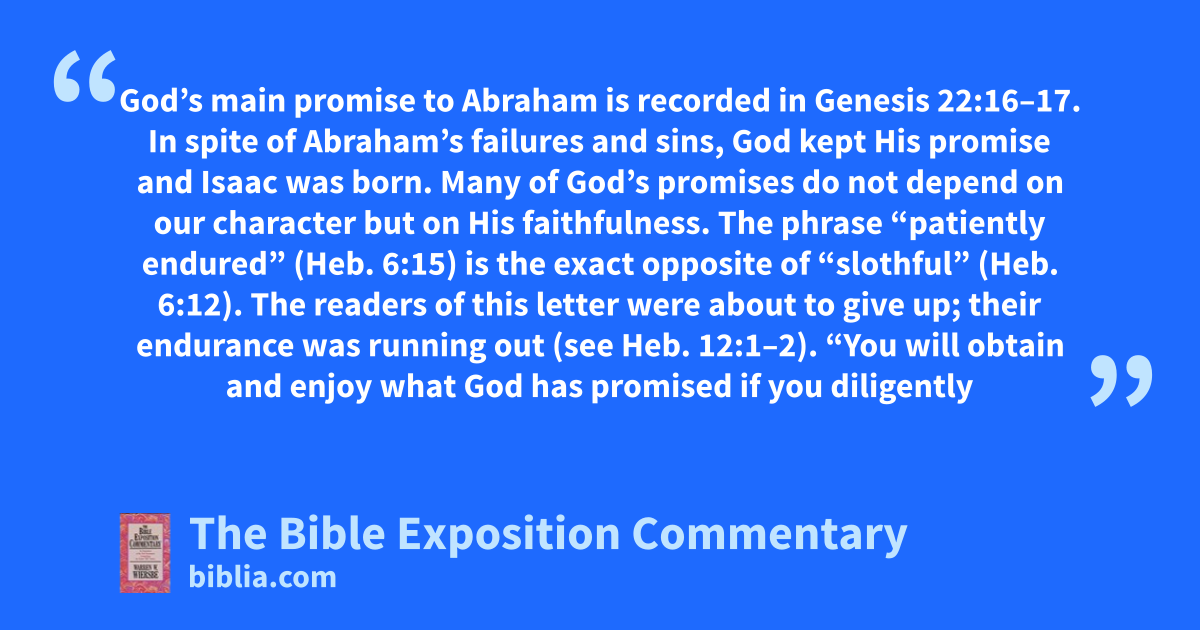 God’s main promise to Abraham is recorded in Genesis 22:16–17. In spite of Abraham’s failures and sins, God kept His promise and Isaac was born. Many of God’s promises do not depend on our character but on His faithfulness. The phrase “patiently endured” (Heb. 6:15) is the exact opposite of “slothful” (Heb. 6:12). The readers of this letter were about to give up; their endurance was running out (see Heb. 12:1–2). “You will obtain and enjoy what God has promised if you diligently