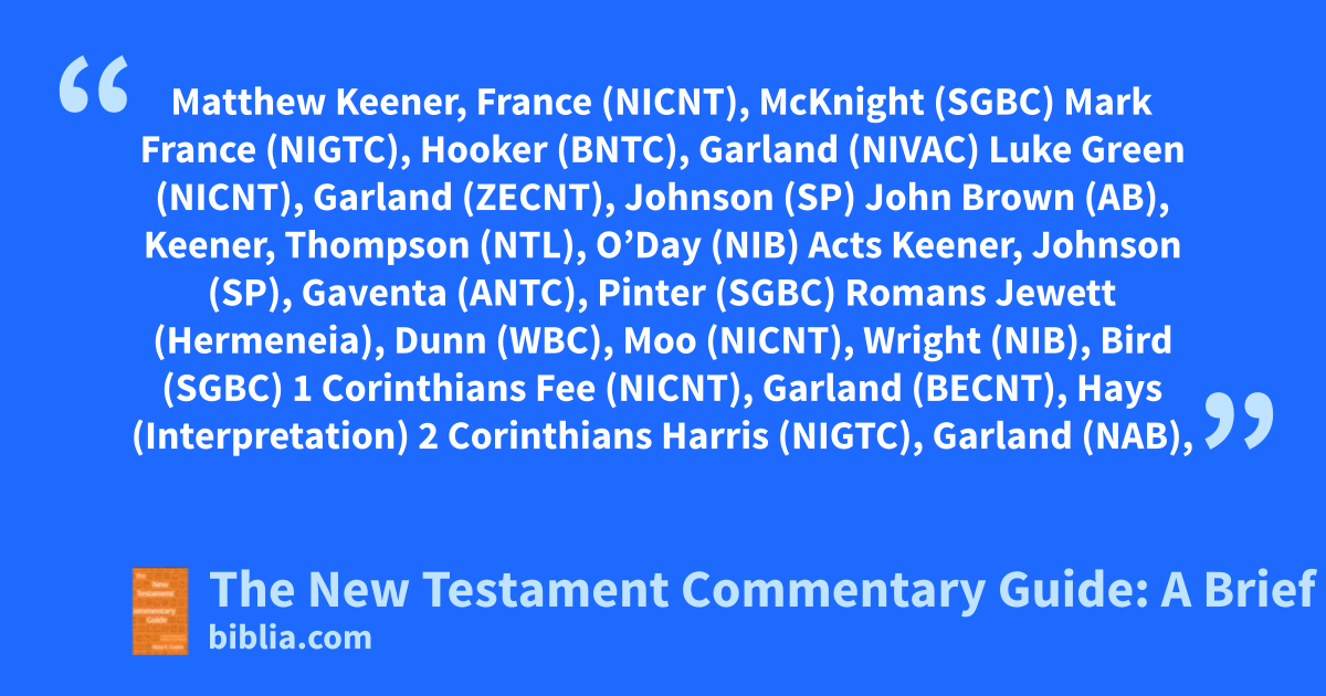 Matthew Keener, France (NICNT), McKnight (SGBC) Mark France (NIGTC), Hooker (BNTC), Garland (NIVAC) Luke Green (NICNT), Garland (ZECNT), Johnson (SP) John Brown (AB), Keener, Thompson (NTL), O’Day (NIB) Acts Keener, Johnson (SP), Gaventa (ANTC), Pinter (SGBC) Romans Jewett (Hermeneia), Dunn (WBC), Moo (NICNT), Wright (NIB), Bird (SGBC) 1 Corinthians Fee (NICNT), Garland (BECNT), Hays (Interpretation) 2 Corinthians Harris (NIGTC), Garland (NAB),