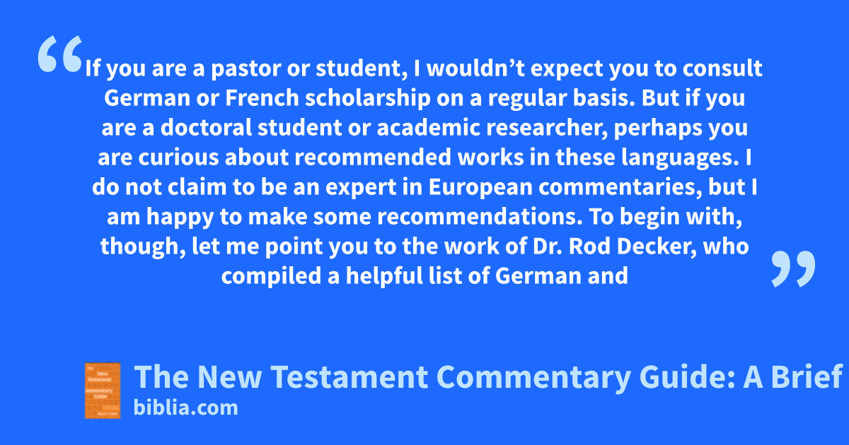 If you are a pastor or student, I wouldn’t expect you to consult German or French scholarship on a regular basis. But if you are a doctoral student or academic researcher, perhaps you are curious about recommended works in these languages. I do not claim to be an expert in European commentaries, but I am happy to make some recommendations. To begin with, though, let me point you to the work of Dr. Rod Decker, who compiled a helpful list of German and
