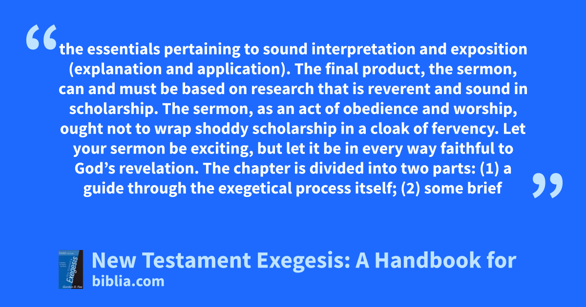 the essentials pertaining to sound interpretation and exposition (explanation and application). The final product, the sermon, can and must be based on research that is reverent and sound in scholarship. The sermon, as an act of obedience and worship, ought not to wrap shoddy scholarship in a cloak of fervency. Let your sermon be exciting, but let it be in every way faithful to God’s revelation. The chapter is divided into two parts: (1) a guide through the exegetical process itself; (2) some brief