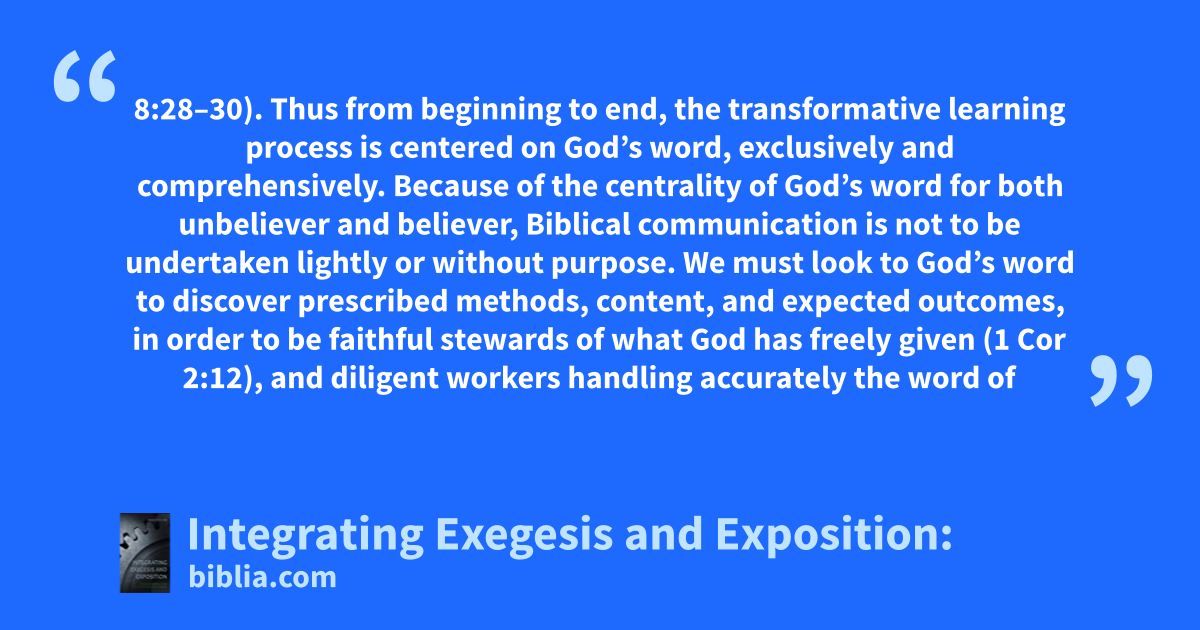 8:28–30). Thus from beginning to end, the transformative learning process is centered on God’s word, exclusively and comprehensively. Because of the centrality of God’s word for both unbeliever and believer, Biblical communication is not to be undertaken lightly or without purpose. We must look to God’s word to discover prescribed methods, content, and expected outcomes, in order to be faithful stewards of what God has freely given (1 Cor 2:12), and diligent workers handling accurately the word of