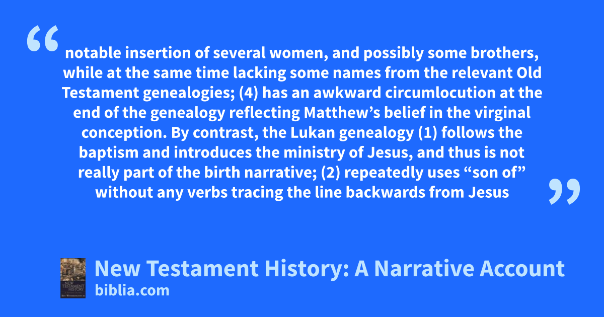 notable insertion of several women, and possibly some brothers, while at the same time lacking some names from the relevant Old Testament genealogies; (4) has an awkward circumlocution at the end of the genealogy reflecting Matthew’s belief in the virginal conception. By contrast, the Lukan genealogy (1) follows the baptism and introduces the ministry of Jesus, and thus is not really part of the birth narrative; (2) repeatedly uses “son of” without any verbs tracing the line backwards from Jesus
