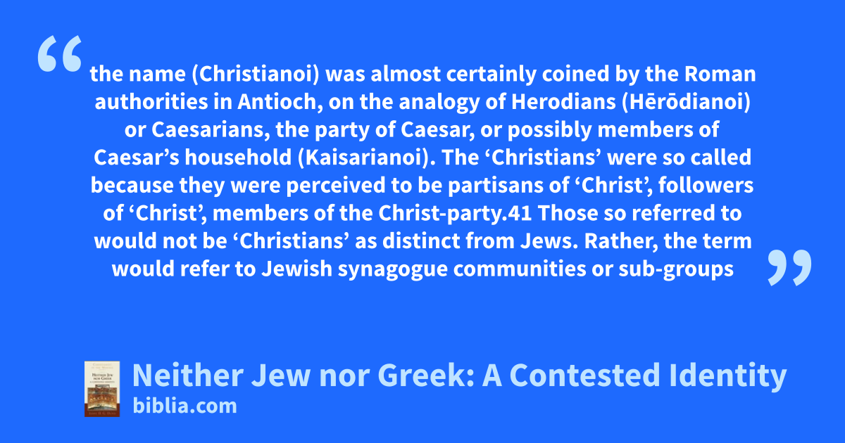 the name (Christianoi) was almost certainly coined by the Roman authorities in Antioch, on the analogy of Herodians (Hērōdianoi) or Caesarians, the party of Caesar, or possibly members of Caesar’s household (Kaisarianoi). The ‘Christians’ were so called because they were perceived to be partisans of ‘Christ’, followers of ‘Christ’, members of the Christ-party.41 Those so referred to would not be ‘Christians’ as distinct from Jews. Rather, the term would refer to Jewish synagogue communities or sub-groups