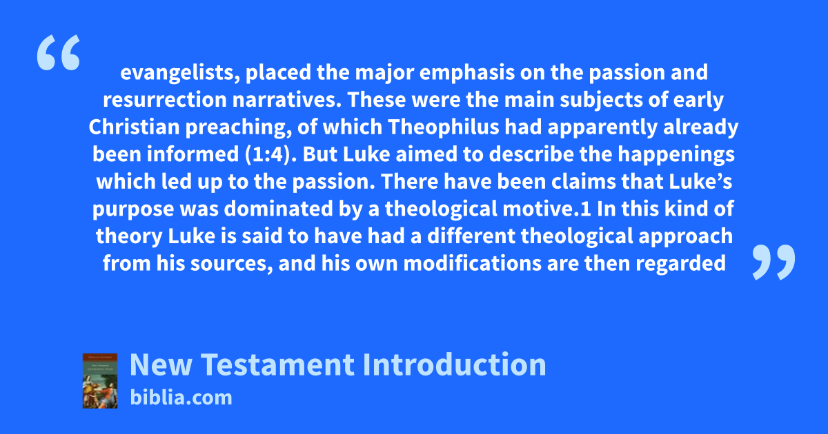 evangelists, placed the major emphasis on the passion and resurrection narratives. These were the main subjects of early Christian preaching, of which Theophilus had apparently already been informed (1:4). But Luke aimed to describe the happenings which led up to the passion. There have been claims that Luke’s purpose was dominated by a theological motive.1 In this kind of theory Luke is said to have had a different theological approach from his sources, and his own modifications are then regarded