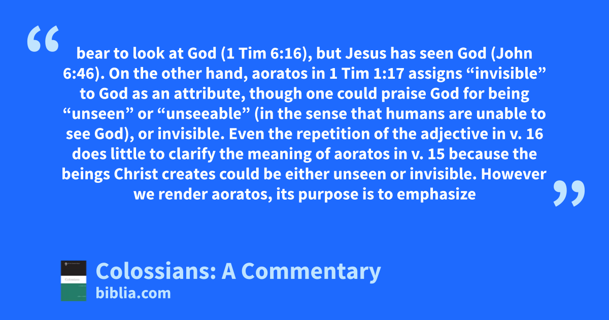 bear to look at God (1 Tim 6:16), but Jesus has seen God (John 6:46). On the other hand, aoratos in 1 Tim 1:17 assigns “invisible” to God as an attribute, though one could praise God for being “unseen” or “unseeable” (in the sense that humans are unable to see God), or invisible. Even the repetition of the adjective in v. 16 does little to clarify the meaning of aoratos in v. 15 because the beings Christ creates could be either unseen or invisible. However we render aoratos, its purpose is to emphasize