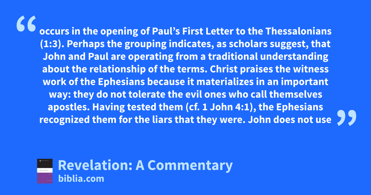 occurs in the opening of Paul’s First Letter to the Thessalonians (1:3). Perhaps the grouping indicates, as scholars suggest, that John and Paul are operating from a traditional understanding about the relationship of the terms. Christ praises the witness work of the Ephesians because it materializes in an important way: they do not tolerate the evil ones who call themselves apostles. Having tested them (cf. 1 John 4:1), the Ephesians recognized them for the liars that they were. John does not use