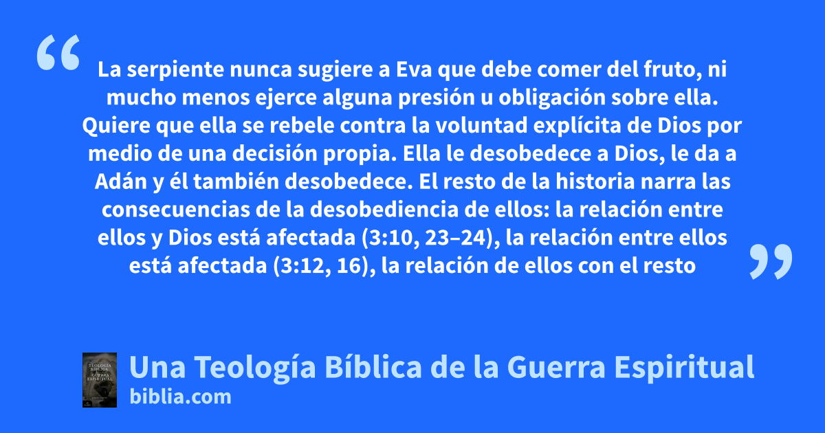 La serpiente nunca sugiere a Eva que debe comer del fruto, ni mucho menos ejerce alguna presión u obligación sobre ella. Quiere que ella se rebele contra la voluntad explícita de Dios por medio de una decisión propia. Ella le desobedece a Dios, le da a Adán y él también desobedece. El resto de la historia narra las consecuencias de la desobediencia de ellos: la relación entre ellos y Dios está afectada (3:10, 23–24), la relación entre ellos está afectada (3:12, 16), la relación de ellos con el resto