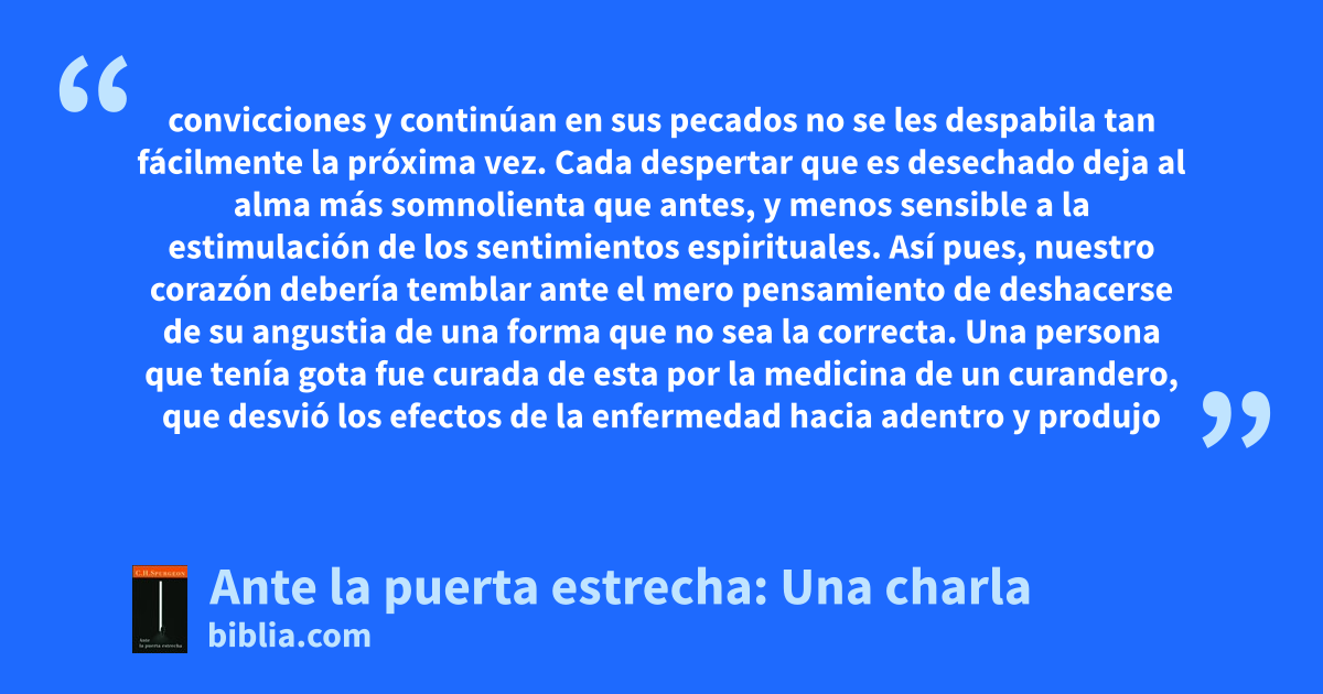 convicciones y continúan en sus pecados no se les despabila tan fácilmente la próxima vez. Cada despertar que es desechado deja al alma más somnolienta que antes, y menos sensible a la estimulación de los sentimientos espirituales. Así pues, nuestro corazón debería temblar ante el mero pensamiento de deshacerse de su angustia de una forma que no sea la correcta. Una persona que tenía gota fue curada de esta por la medicina de un curandero, que desvió los efectos de la enfermedad hacia adentro y produjo