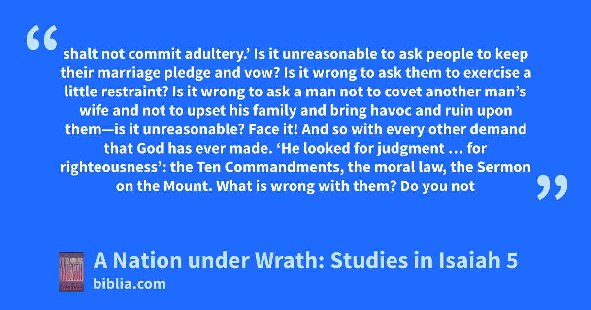 shalt not commit adultery.’ Is it unreasonable to ask people to keep their marriage pledge and vow? Is it wrong to ask them to exercise a little restraint? Is it wrong to ask a man not to covet another man’s wife and not to upset his family and bring havoc and ruin upon them—is it unreasonable? Face it! And so with every other demand that God has ever made. ‘He looked for judgment … for righteousness’: the Ten Commandments, the moral law, the Sermon on the Mount. What is wrong with them? Do you not