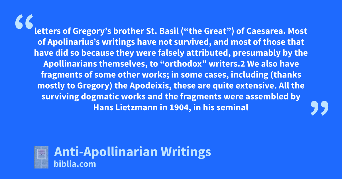 letters of Gregory’s brother St. Basil (“the Great”) of Caesarea. Most of Apolinarius’s writings have not survived, and most of those that have did so because they were falsely attributed, presumably by the Apollinarians themselves, to “orthodox” writers.2 We also have fragments of some other works; in some cases, including (thanks mostly to Gregory) the Apodeixis, these are quite extensive. All the surviving dogmatic works and the fragments were assembled by Hans Lietzmann in 1904, in his seminal