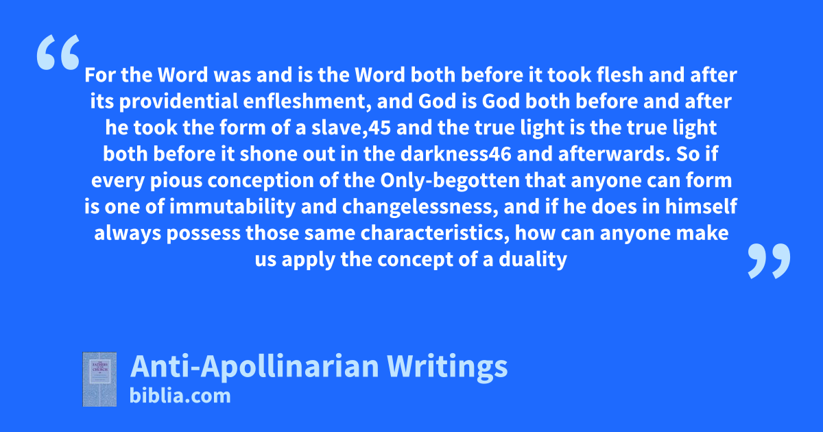 For the Word was and is the Word both before it took flesh and after its providential enfleshment, and God is God both before and after he took the form of a slave,45 and the true light is the true light both before it shone out in the darkness46 and afterwards. So if every pious conception of the Only-begotten that anyone can form is one of immutability and changelessness, and if he does in himself always possess those same characteristics, how can anyone make us apply the concept of a duality