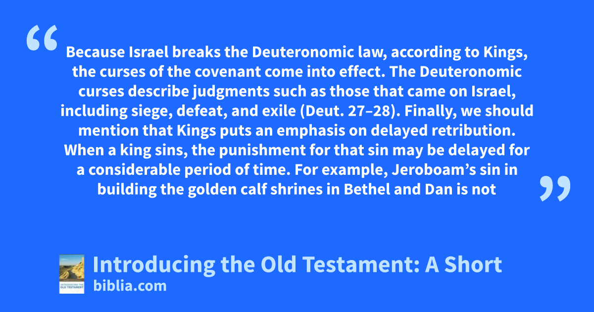 Because Israel breaks the Deuteronomic law, according to Kings, the curses of the covenant come into effect. The Deuteronomic curses describe judgments such as those that came on Israel, including siege, defeat, and exile (Deut. 27–28). Finally, we should mention that Kings puts an emphasis on delayed retribution. When a king sins, the punishment for that sin may be delayed for a considerable period of time. For example, Jeroboam’s sin in building the golden calf shrines in Bethel and Dan is not