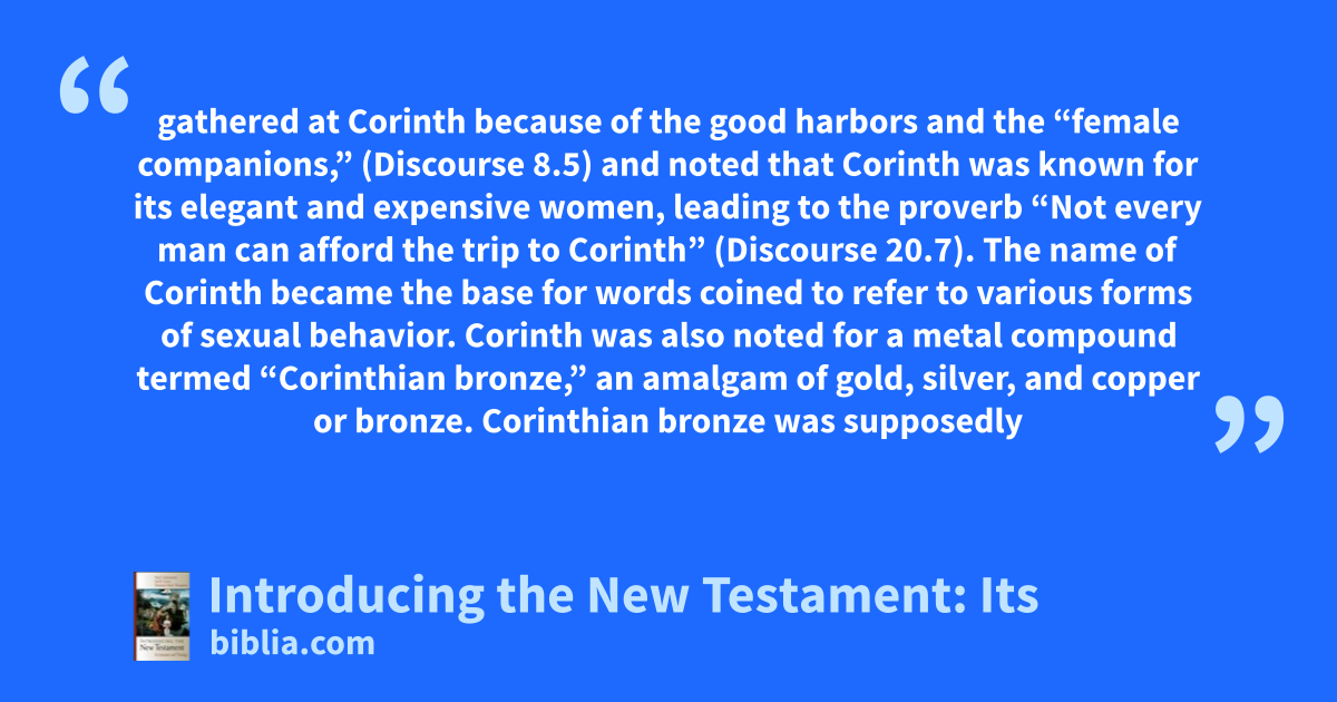 gathered at Corinth because of the good harbors and the “female companions,” (Discourse 8.5) and noted that Corinth was known for its elegant and expensive women, leading to the proverb “Not every man can afford the trip to Corinth” (Discourse 20.7). The name of Corinth became the base for words coined to refer to various forms of sexual behavior. Corinth was also noted for a metal compound termed “Corinthian bronze,” an amalgam of gold, silver, and copper or bronze. Corinthian bronze was supposedly