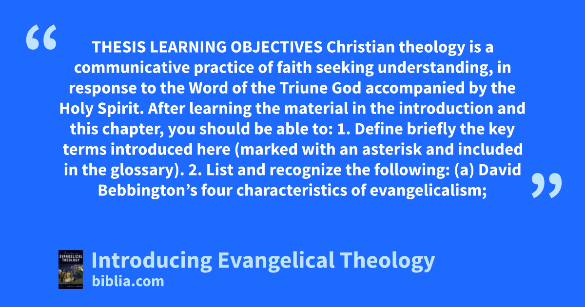 THESIS LEARNING OBJECTIVES Christian theology is a communicative practice of faith seeking understanding, in response to the Word of the Triune God accompanied by the Holy Spirit. After learning the material in the introduction and this chapter, you should be able to: 1. Define briefly the key terms introduced here (marked with an asterisk and included in the glossary). 2. List and recognize the following: (a) David Bebbington’s four characteristics of evangelicalism;