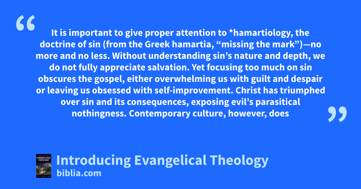 It is important to give proper attention to *hamartiology, the doctrine of sin (from the Greek hamartia, “missing the mark”)—no more and no less. Without understanding sin’s nature and depth, we do not fully appreciate salvation. Yet focusing too much on sin obscures the gospel, either overwhelming us with guilt and despair or leaving us obsessed with self-improvement. Christ has triumphed over sin and its consequences, exposing evil’s parasitical nothingness. Contemporary culture, however, does