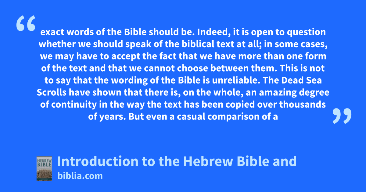 exact words of the Bible should be. Indeed, it is open to question whether we should speak of the biblical text at all; in some cases, we may have to accept the fact that we have more than one form of the text and that we cannot choose between them. This is not to say that the wording of the Bible is unreliable. The Dead Sea Scrolls have shown that there is, on the whole, an amazing degree of continuity in the way the text has been copied over thousands of years. But even a casual comparison of a