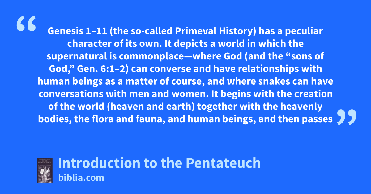 Genesis 1–11 (the so-called Primeval History) has a peculiar character of its own. It depicts a world in which the supernatural is commonplace—where God (and the “sons of God,” Gen. 6:1–2) can converse and have relationships with human beings as a matter of course, and where snakes can have conversations with men and women. It begins with the creation of the world (heaven and earth) together with the heavenly bodies, the flora and fauna, and human beings, and then passes