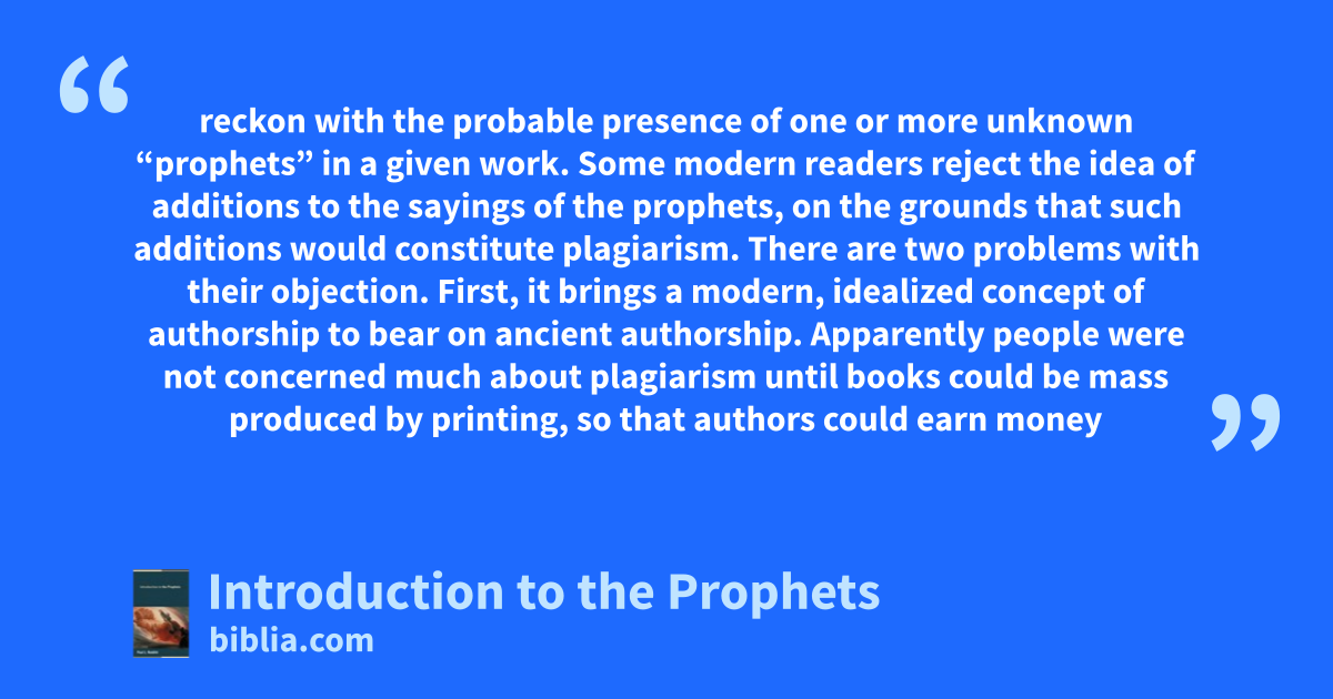 reckon with the probable presence of one or more unknown “prophets” in a given work. Some modern readers reject the idea of additions to the sayings of the prophets, on the grounds that such additions would constitute plagiarism. There are two problems with their objection. First, it brings a modern, idealized concept of authorship to bear on ancient authorship. Apparently people were not concerned much about plagiarism until books could be mass produced by printing, so that authors could earn money