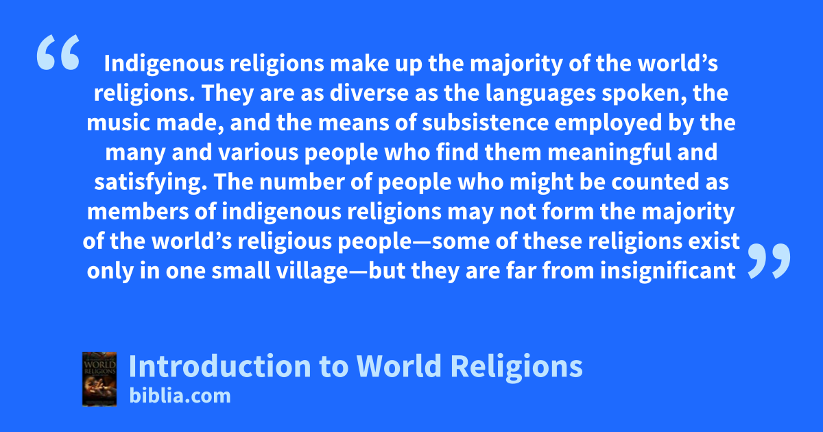 Indigenous religions make up the majority of the world’s religions. They are as diverse as the languages spoken, the music made, and the means of subsistence employed by the many and various people who find them meaningful and satisfying. The number of people who might be counted as members of indigenous religions may not form the majority of the world’s religious people—some of these religions exist only in one small village—but they are far from insignificant